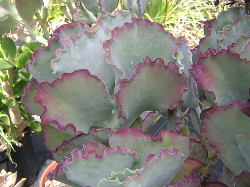 Buisson pouvant atteindre 50 cm de hauteur. Les feuilles, aux bords très ondulés, sont couvertes d'une pruine blanche et se colorent d'une marge rougeâtre quand on cultive la plante au soleil.